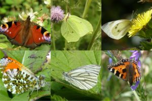 Peacock and Red Admiral, Green-veined Whites as well as Small White, Brimstones and lots of Orange Tips.