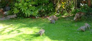There is a litter of 6 fox cubs nearby from a den under a shed is a nearby garden. The father helps feed the cubs while the mother keeps mainly in the den.